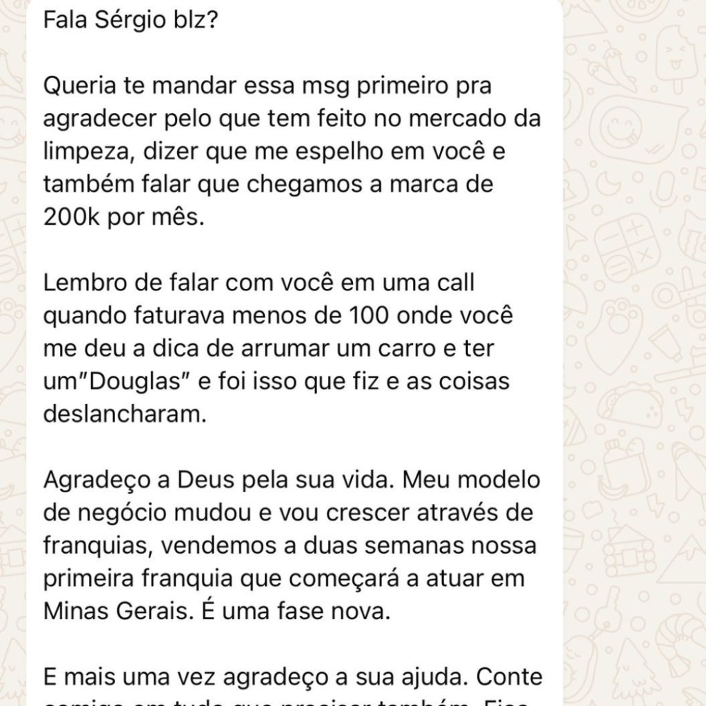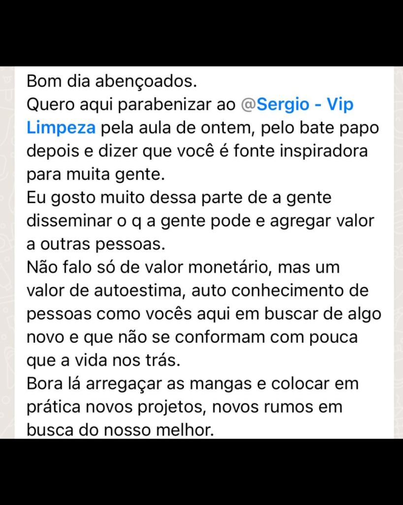 Sergio Hoefling é empresário do ramo da limpeza e já atuou em todas as funções, adquirindo experiência para abrir sua própria empresa, a Vip Limpeza. E hoje, através de seus cursos e nas redes sociais, ajuda milhares de pessoas a acreditarem que elas podem fazer mais e levarem sua vida pessoal e profissional para um novo patamar através de treinamentos simples, práticos e diferentes dos conteúdos pesados e extremamente técnicos que encontramos por aí.